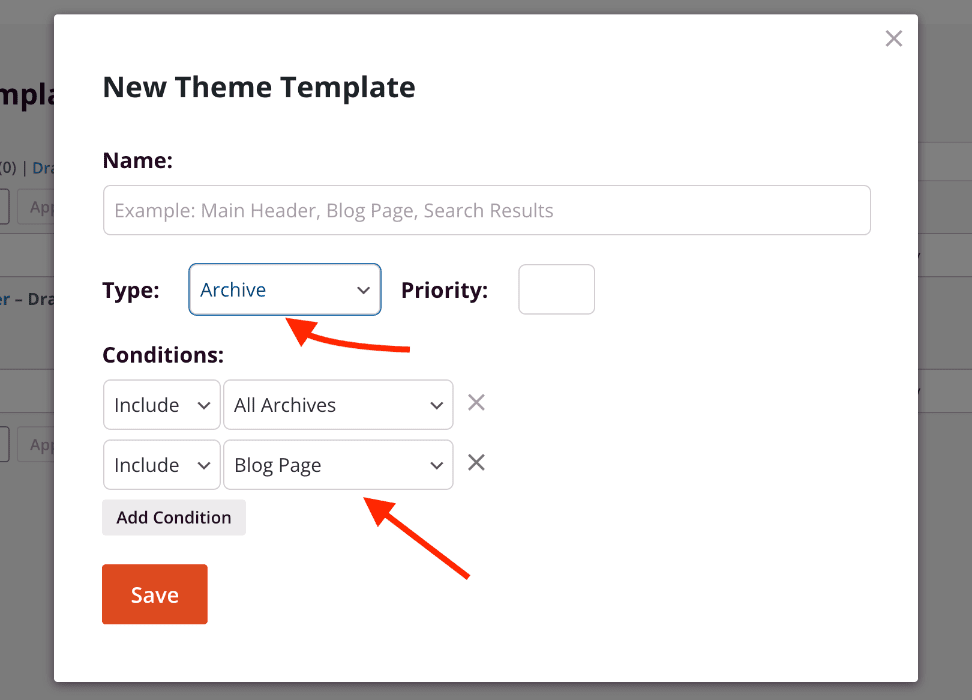 To create templates for your archive pages, select the Archive type option in the New Theme Template modal box and set up the theme conditions for this template. After completing your archive template setup, click Save to begin designing your single post template.