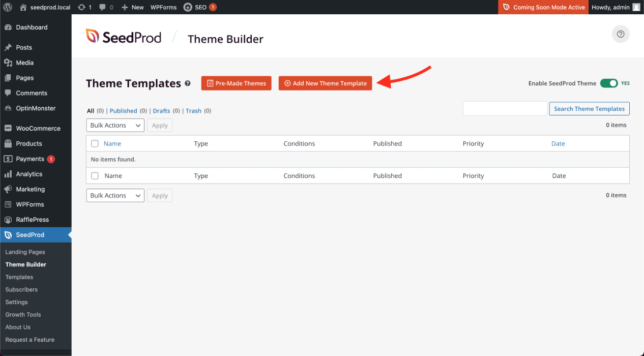 1. Go to SeedProd > Theme Builder in your WP admin dashboard and click the Add New Theme Template button at the top of the page.