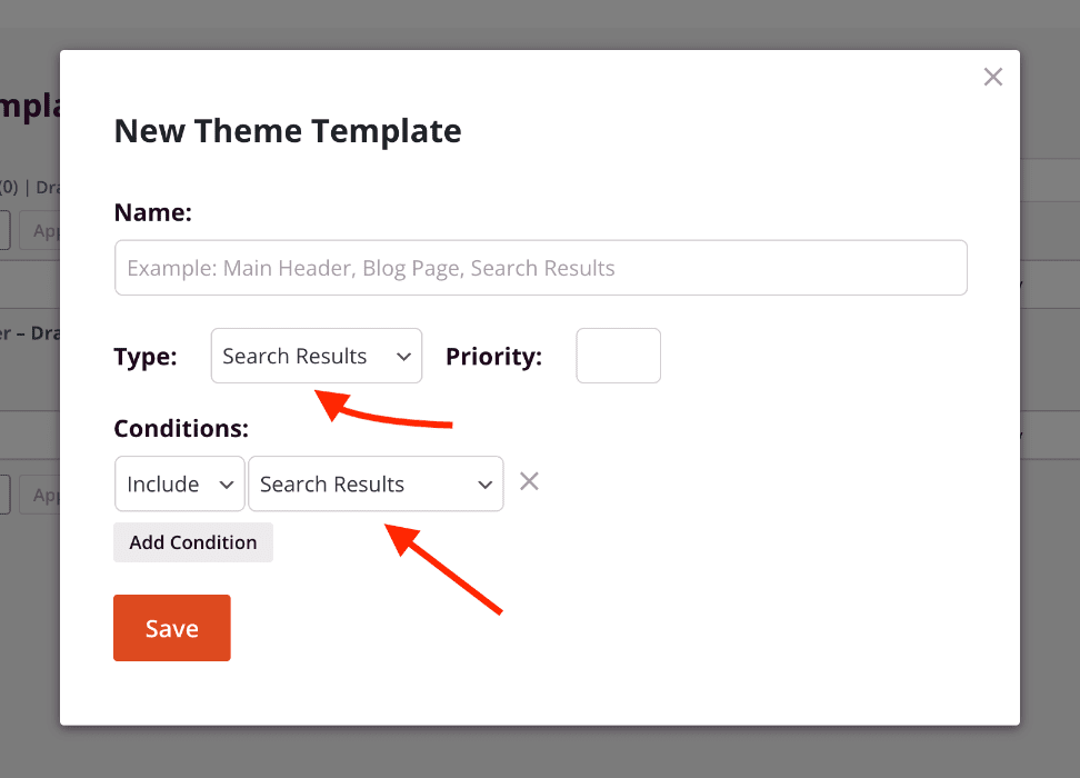 To create your search results page template, select the Search Results type option in the New Theme Template modal box and set the theme conditions to Include | Search Results for this template.