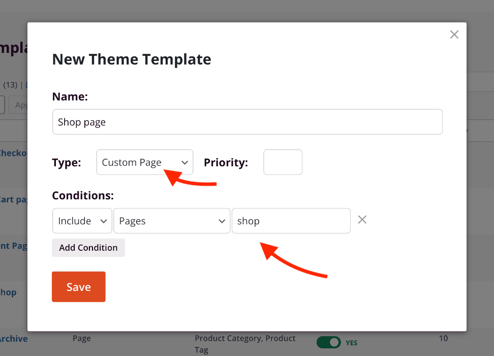 You can start by creating a new Custom Page template with the specific conditions to include the page with the slug of the assigned WooCommerce shop page. By default, the shop page has the slug “shop”, so the template conditions may follow the syntax Include | Pages | shop as seen in our screenshot below.