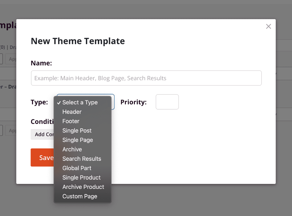 Like your header template, you can create a footer template by selecting the Footer Type option in the New Theme Template modal box. You may also set the footer template conditions and priority here to determine when and where this template will be shown.