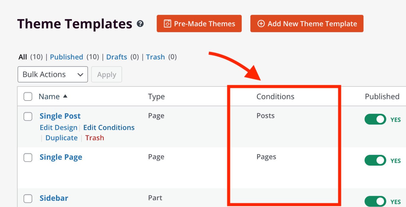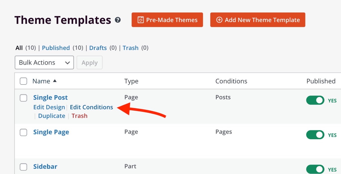 You can also edit the conditions for a template you’ve already created with the same conditions functionality seen while adding a new theme template. To do this, please follow the steps below.