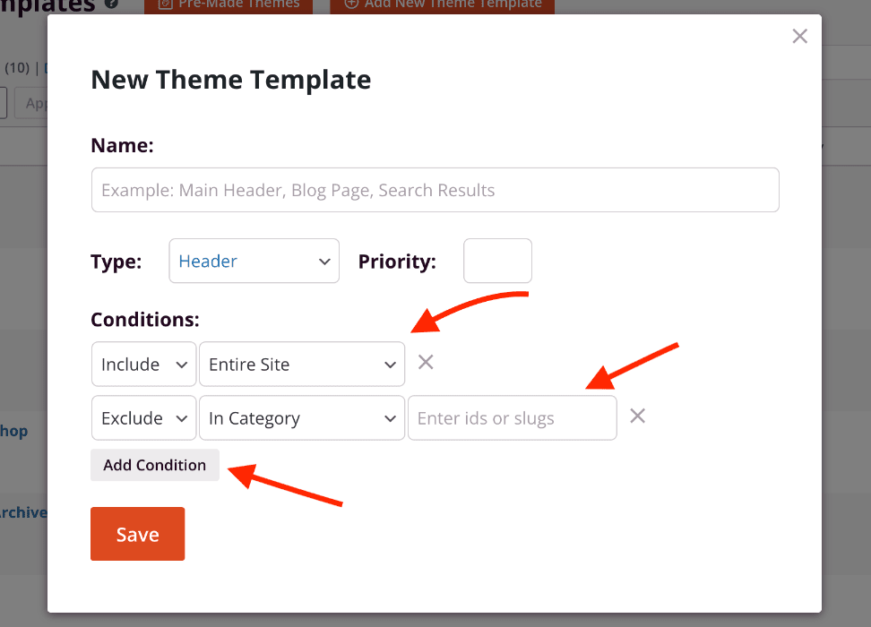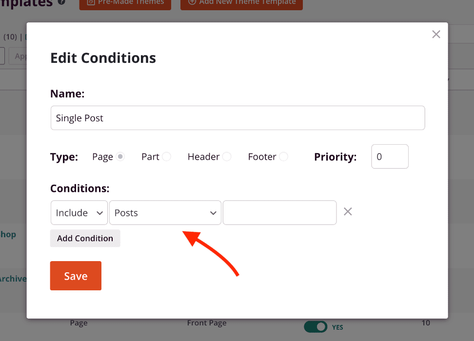 2. Within the Edit Conditions modal box, you can modify the existing theme template’s conditions under the Conditions section. Click Save when you’re finished to save these changes.